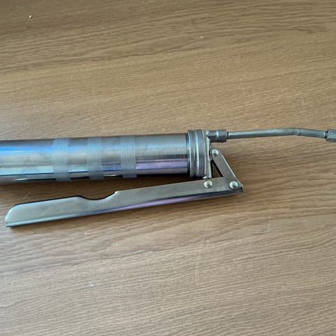 Fodpumpe med manometer og rød slange. Pumpe med fodplade og trykmåler øverst, egnet til oppumpning af fx cykel- og bildæk samt andre genstande med tilsvarende ventiler. Leveres med slange og ventiladaptere som vist på billedet.