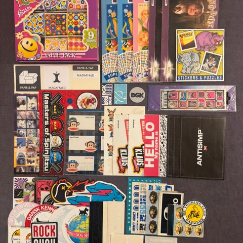 Blandet parti klistermærker med forskellige tegneserie- og figurmotiver i flere farver og former. Velegnet til dekoration af fx computer, notesbøger, mapper eller andre glatte overflader. Klistermærkerne er udskårne enkeltvis og består af trykt folie med klæbende bagside.