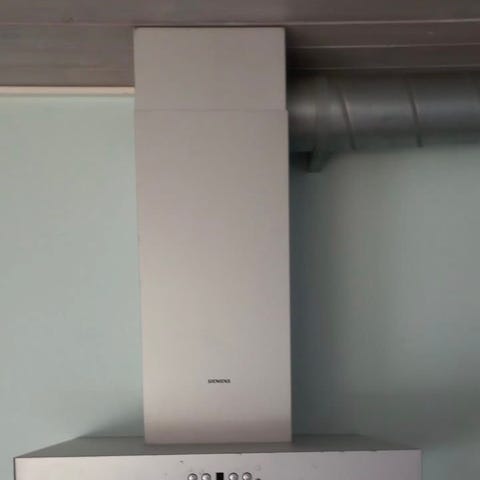 Emhætte til vægmontering i rustfrit stål med buet glasfront. Velegnet til montering over komfur eller kogeplade i køkken. Emhætten har skorsten op mod loftet og en buet glasplade, der dækker kogezonen.