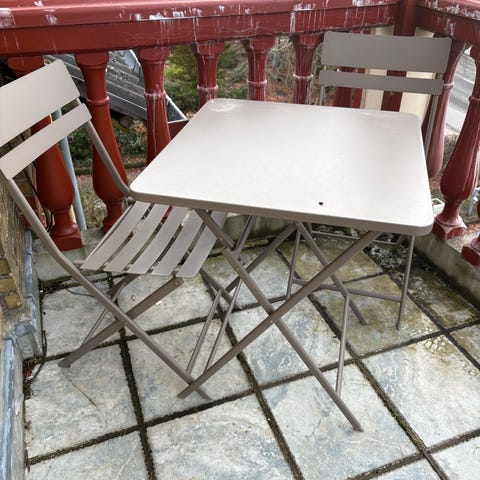 Cafésæt bestående af rundt bord og to stole. Bordet har metalstel og rundt bordplade. Stolene har metalstel med gråt flet i sæde og ryg. Sættet er egnet til udendørs brug, f.eks. på altan, terrasse eller mindre havearealer.