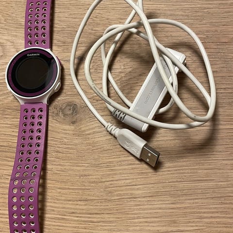 Garmin Forerunner 220 sportsur i lilla og hvid. GPS-løbeur med rund urskive og perforeret silikonerem. Digitalt display med tid og dato. Leveres med opladerkabel som vist på billederne. Velegnet til løb og anden træning, hvor der ønskes registrering af tid og distance.