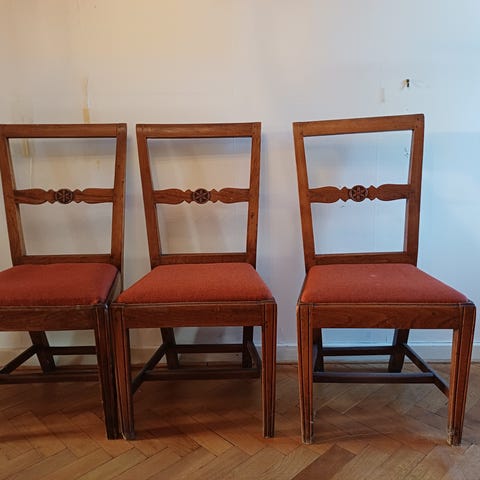 2 antikke spisebordsstole i træ med polstrede sæder. Stolene har hver sit klassiske ryglæn med udskæringer. Sæderne har forskellige stofbetræk med stribede mønstre i gule og røde/grønne nuancer. Egnet til brug ved spisebord eller som ekstra stol i stue eller køkken.