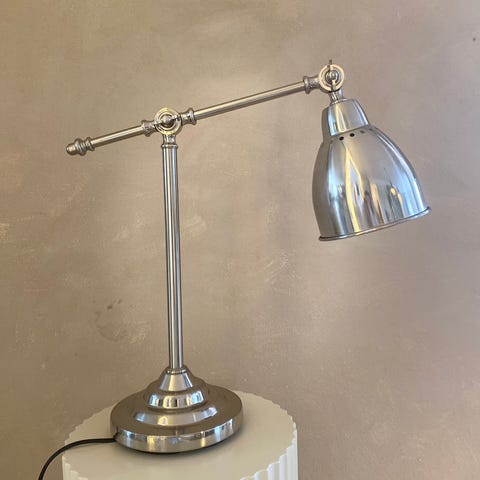 Lampens buede form gør den velegnet som hyggebelysning på kommode, natbord eller i vindueskarm.