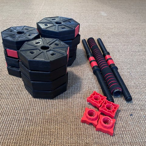 Håndvægtsæt og curlstang med vægtskiver i taske