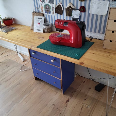 Renoveringsprojekt, da bordplade er afkortet i begge ender og slidt. Ellers ok stand på skuffedarie. Nøgle mangler.