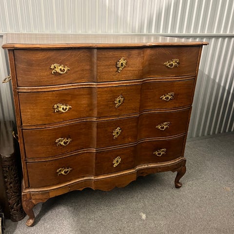 Kommode i træ med fire skuffer og dekorative messinggreb. Fronten har fineret træ med markant åretegning, mens sider og top er i massivt træ. Øverste skuffe er inddelt i rum, som kan bruges til mindre genstande.