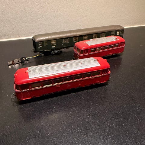 Modeltog sæt mærket Märklin, bestående af et mindre damplokomotiv 5 godsvogne. Sættet omfatter åbne, røde godsvogne, en lukket godsvogn samt en tankvogn med Carlsberg‑dekoration. Toget fremstår som klassisk modeljernbaneudstyr egnet til brug på modeltogbaner.