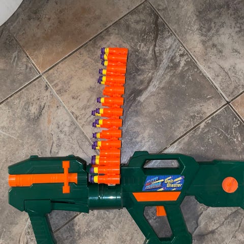 Nerf legetøjsblaster sæt i plast i farverne orange og blå. Sættet består af flere forskellige blastere i håndstørrelse samt tilhørende magasiner i forskellige længder. Delene er udført i hård plast med typiske Nerf-signalfarver. Egnet som legetøj til skud med skumprojektiler (pile eller darts), afhængigt af kompatible Nerf-typer. Sættet kan bruges til leg både inde og ude, fx til Nerf-kampe eller målskydning. Ingen skumprojektiler fremgår af billederne.