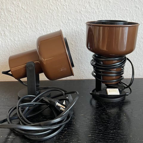 Kan dreje og vippe, har huller til ophæng på vægpladen, har stik og ledninger med afbryder påmonteret. Alle har intakte reflektorskærme og sort gitter.