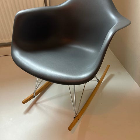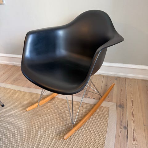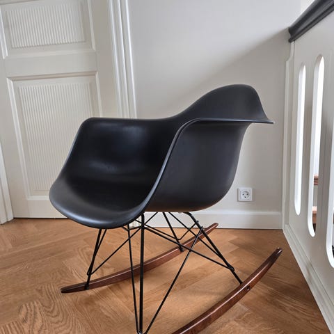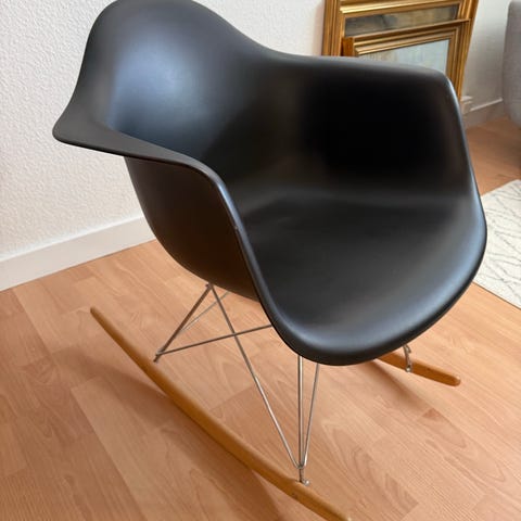 Smuk og tidløs Eames gyngestol i sort. Klassisk design med god siddekomfort og elegante træmeder. Stolen fremstår i flot stand og passer perfekt ind i både moderne og klassisk indretning.