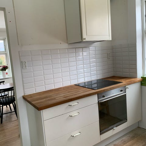 Hvid køkkenindretning med overskabe, underskabe, bordplade og emhætte