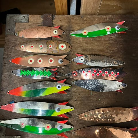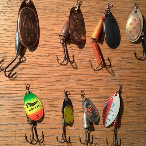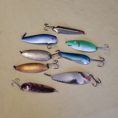 10 stk lakse spinnere på 20-21 gram med str 4 blade og fastmonterede spring ringe 300 kr + porto