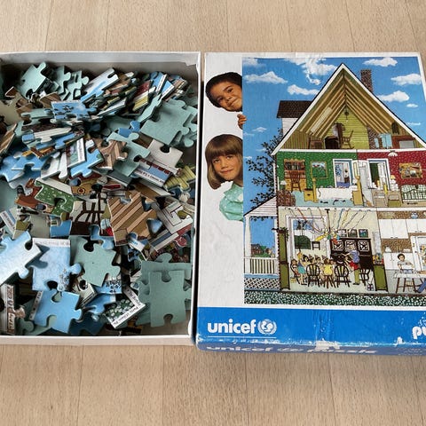 Fint og velholdt puslespil, størrelse 46x45 med 196 brikker. Forestiller en lille landsby med legende børn og en luftballon. jeg sender gerne og hurtigt. Se gerne mine øvrige annoncer under min profil.