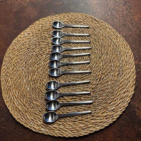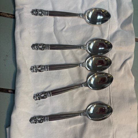8 teskeer er af modellen "Prisme" i mat rustfrit stål, 400kr pr stk
