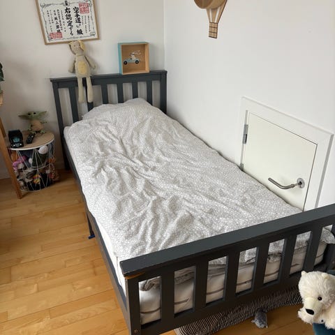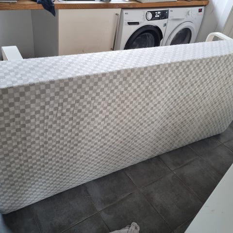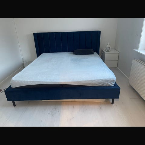 Blå marine velour seng med sengegavl skal væk pga flytning. uden madrasse.