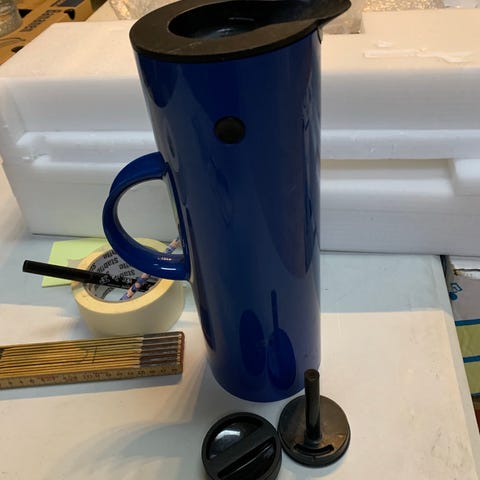 Stelton termokande i blå plast med sort låg. Klassisk cylindrisk model med hank og udskiftelige lågdele, som ses på billederne. Indvendig glasindsats til varme drikke. Velegnet til servering af kaffe, te eller andre varme drikke i hjemmet eller på kontoret.