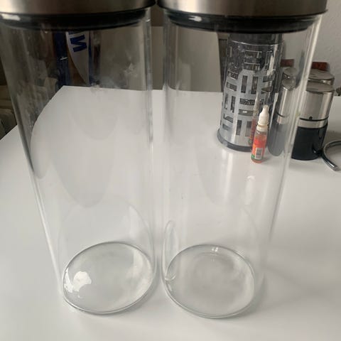 IKEA opbevaringsglas med låg. Sættet består af to gennemsigtige glasbeholdere med matchende låg i lys farve. Velegnet til opbevaring af tørvarer som pasta, ris, mel eller snacks i køkkenet. Kan også bruges til generel opbevaring i hjemmet, hvor indholdet ønskes synligt gennem glasset.
