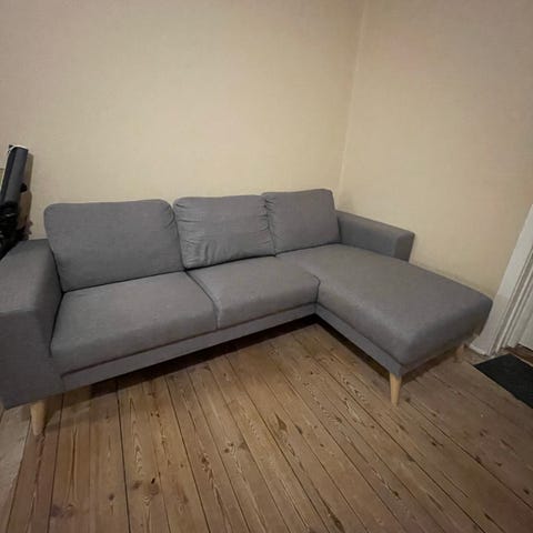 Stor grå sofa med chaiselong - mindre huller på bagsiden af et par af puderne ellers i god stand BORTGIVES til fri afhentning