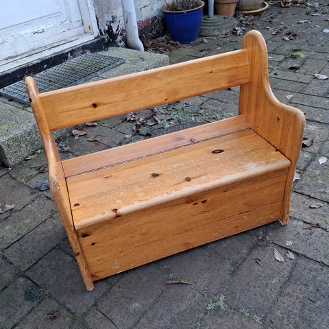Sød lille børnebænk med opbevaringsmuligheder.