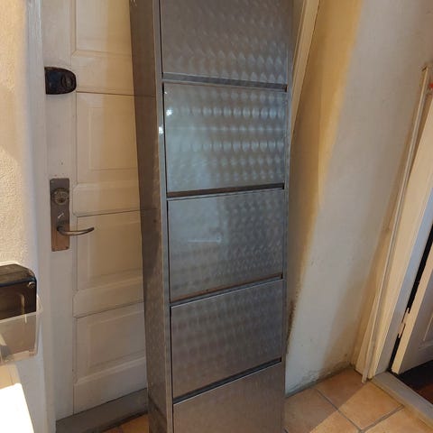 Metalskab til opbevaring af 20 par sko i aluminium/sort. Fungerer fint. Der er lidt hvid farve på siden. 170x50x18 cm.
