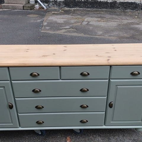 nyslebet, nymalet i en flot antikgrøn farve som giver et smukt spil sammen med træets farve og med fine nye greb.
