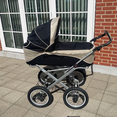 Odder barnevogn i sort med lys inderside. Vognen har stor kaleche og liggedel samt justerbart styr. Den står på fire faste hjul og har kurv under vognen til opbevaring. Medfølger: