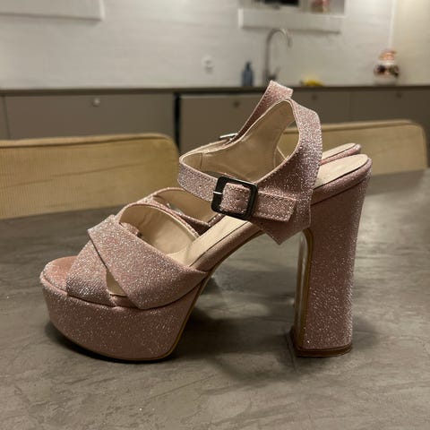 Plateau højhælede sko i størrelse 40. Skoene er i sort lak med høj blokhæl og plateau-sål. Overdelen har mange smalle remme med dekorative bling spænder. Remme snoes flere gange rundt om anklen. Velegnet som fest- eller aftensko.