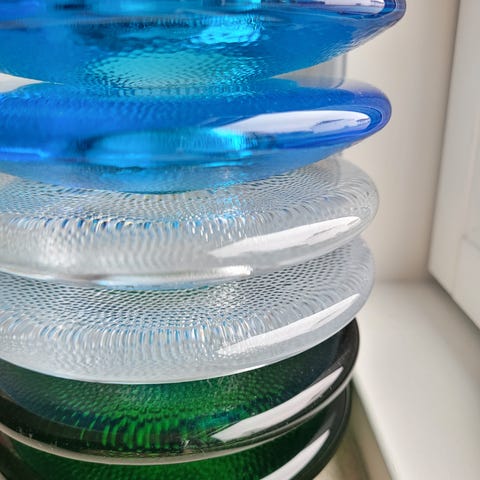 Runde buttede former med tyk kant. Kan også anvendes til bloklys elr småskåle multifunktionelle. Praktiske kan stakkes.