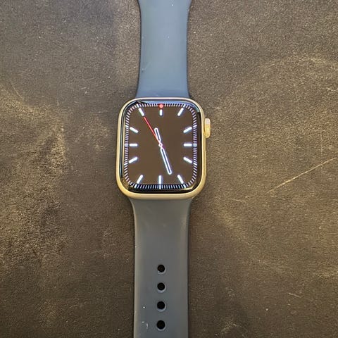Apple Watch Series 8 smartwatch med rektangulært touchskærm og digital krone i siden. Uret har lysegråt silikone sportsarmbånd med justerbar lukning. Medfølgende magnetisk opladerkabel ses på billederne. Velegnet til daglig brug, aktivitetssporing og notifikationer, når det er forbundet til en kompatibel iPhone.
