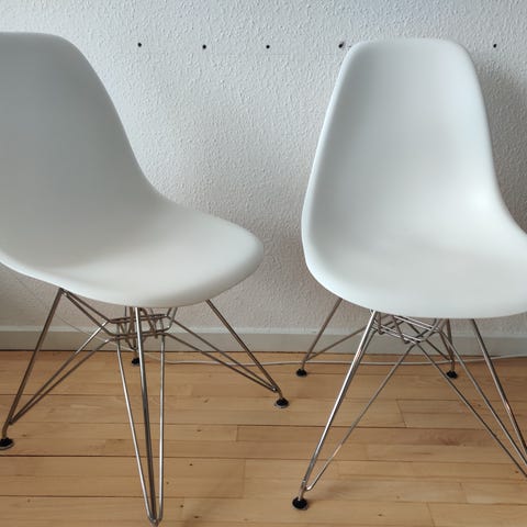 4 spisebordsstole i hvid. Har lyse træben. Er meget robuste. De trænger til en rigtig god rengøring i det hvide “skind”. Ved ikke hvilket materiale det er.