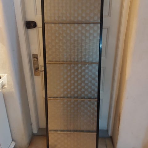 Metalskab til opbevaring af 20 par sko. Fungerer fint. Fagene kan åbnes enkeltvis. Der er lidt hvid farve på siderne. 171x50,5x15,5 cm.