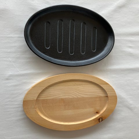 Fire støbejerns tallerkener fra Holm. Der er en tang med til at flytte tallerkenerne med, når de er varme samt fire serveringskurve til pommes frites.