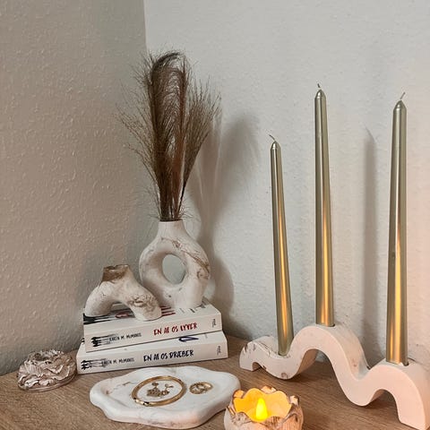 Dekorationssæt til hjemmet bestående af flere dele. Sættet inkluderer en lysestage til tre lys i hvid og guld, en lille vase i hvid, en lille skål formet som en blomst i mørkeblå samt en lille beholder med låg i mørkeblå med gulddetaljer. Der medfølger desuden et rektangulært fad eller bakke, som elementerne kan placeres på, samt bogstaverne HOME til dekoration. Sættet er egnet som bord- eller vindueskarmdekoration i stue, soveværelse eller entré.