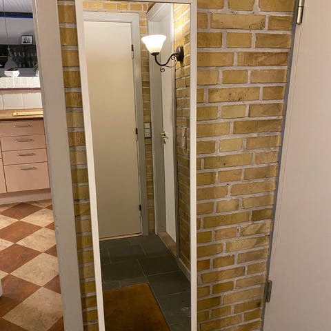 IKEA spejl med hvid ramme. Rektangulært spejl, egnet til vægmontering eller opstilling op ad væg. Rammen er i hvidt materiale med enkel, glat profil. Velegnet til brug i entré, soveværelse eller garderobe til fuldkropsspejling.