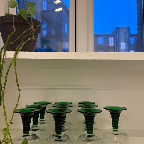 Har de her fem utroligt smukke vinglas i krystal fra Rømer. Vidunderlige farve og facet slibninger gør dem til alle vin elskeres Bucket-List. Jeg har fem og de er 22 cm høje slanke og elegante og har et meget eksklusivt look. Afhentes samlet meget billigt synes jeg for 300 kr.