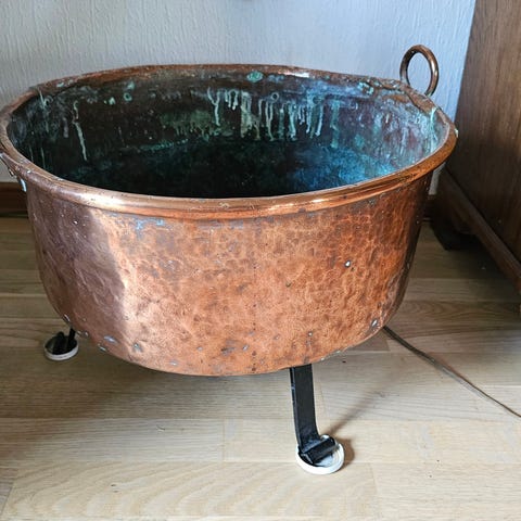Antik meget stor fiskegryde i kobber fra en herregård. ca. højde 26 uden greb og med greb 29 cm. Bredde ca 40 cm. Længde ca med øre 57 og uden 55 cm. Vejer ca 11 kg. Kan evt bruges til blomster eller anden dekoration