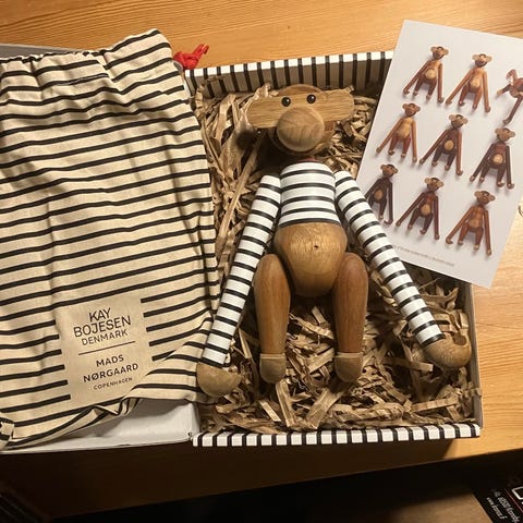 Kay Bojesen Mads Nørgaard abe træfigur med stribet bluse. Aben er udført i træ og leveres i æske med stribet stofpose. Designet kombinerer Kay Bojesens klassiske abe med Mads Nørgaards karakteristiske stribede mønster. Velegnet som dekoration i hjemmet eller som samleobjekt.