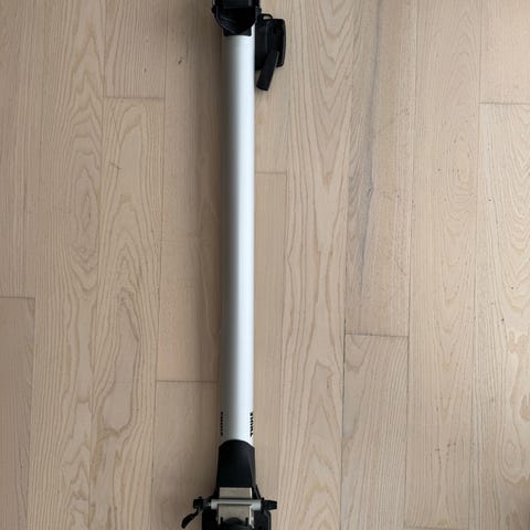 Thule cykelholder til montering på tagbøjler. Holderen er udført i metal med plastkomponenter og er beregnet til transport af én cykel på bilens tag. Der medfølger instruktionsmanual, som viser montering på tagbøjler og fastgørelse af cyklen i skinnen og ved stellet. Velegnet til biler med passende tagbøjlesystem, der kan bære en tagmonteret cykelholder.