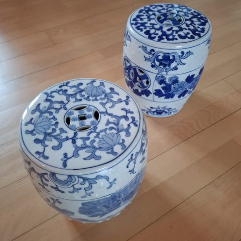 Gammelt kinesisk trommestol/sidebord fra republikkens periode (1912–1949), rundt top Ø63 cm med relieffer af landlige musikere, hårdttræ med lys asktrætop og mørk poleret base med blomsterguirlander, glasplade tilføjet som sidesbord, oprindelse Kina (Guangdong), god stand med aldersrelaterede tegn, vægt ca. 15–20 kg. Klik på den blå "gå til varen" knap, for at købe eller byde på denne vare. Den samlede pris vil blive vist inden du afgiver dit bud.
