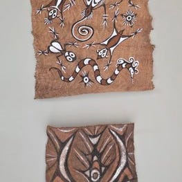 Tapa-maleri af bark på træbast fra Papua Ny-Guiné, dateret til midten af det 20. århundrede, 94 cm høj, 50 cm bred, 1 cm dyb, i god stand, fra privat samling, oprindeligt navn Tapa. Klik på den blå "gå til varen" knap, for at købe eller byde på denne vare. Den samlede pris vil blive vist inden du afgiver dit bud.