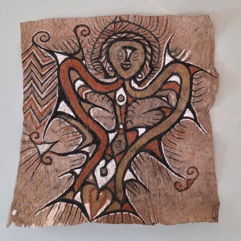 Smukt maleri på udkløvet bomrebark (Tapa). Stammer fra Humboldtbugten-området. Indsamlet af Jac Hoogerbrugge i 60'erne eller 70'erne og direkte fra hans samling. Med gammelt etiket.
