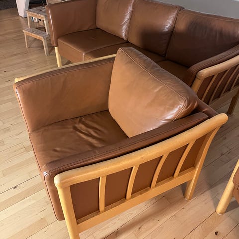 En ok læder sofa, trænger til en om læderfedt og har en hul - vist på billedet.