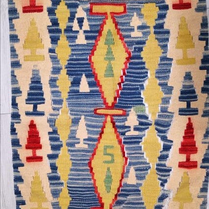 Yuruk håndvævet kilim tæppe, 182 cm × 112 cm, ca. 3 kg, uld på uld, oprindelse Türkiye (Nevşehir, Cappadoccia), 21. århundrede; farverne blå, rød, hvid og flerfarvet, generelt i god stand og professionelt rengjort. Klik på den blå "gå til varen" knap, for at købe eller byde på denne vare. Den samlede pris vil blive vist inden du afgiver dit bud.
