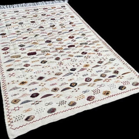 Oprindelse Marokko, model Soumak farvet kilim (ubrugt) håndvævet uld på bomuld, 194 x 146 cm, i meget god stand og professionelt rengjort. Klik på den blå "gå til varen" knap, for at købe eller byde på denne vare. Den samlede pris vil blive vist inden du afgiver dit bud.