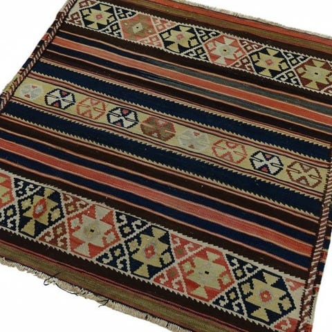 Oprindelse: Usbekistan; Model: Uzbek Tribal Kelim; Håndvævet uld-på-uld Kelim, 185 × 105 cm, flerfarget, midt-20. århundrede, generelt i god stand og professionelt renset. Klik på den blå "gå til varen" knap, for at købe eller byde på denne vare. Den samlede pris vil blive vist inden du afgiver dit bud.