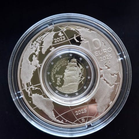 Sammensætning: Bimetallisk (guldcenter 900/1000, sølvring 925/1000). Det er umuligt at skelne sølvdelen og guldandelen separat, som også fremgår af kataloget.