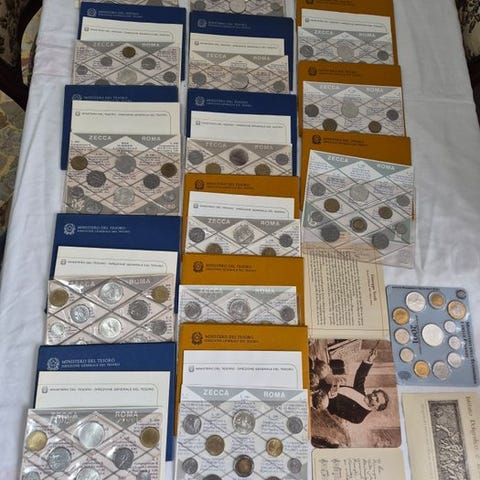 Fuldstændig samling af 500 lire Caravelle fra 1946 til 2001 i sin originale, intakte samlemappe, som ny, ingen tegn. Lidt på grund af sølvet, lidt på grund af tidens gang, er det en samling der fortsat øger sin værdi.