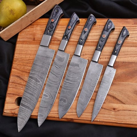 Foldet stål: Med et højkvalitets foldet stålblad er den træbaserede skaft fastgjort med stål mosaiknåle. Komfortabel i hånden, vil du frivilligt melde dig som aftenens kok. For samleren eller mesterkokken er dette sæt knive stilfuldt og holdbart. Hak, hakke, skær og udskær for at blive en mesterkok med dette alsidige køkkenredskab.