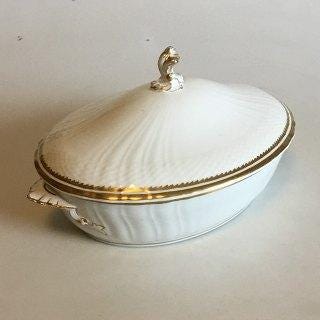 Royal Copenhagen Hvid Svejfet med takket guldkant(Stel 387/ Josephine) Ovalt lågfad No 1702. Måler 13, 5 cm x 28 cm DKK 300,-