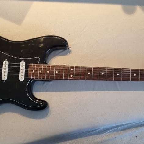 Denne guitar er nærmest ikke blevet spillet på . Guitaren står helt uden brugsspor , helt originalt og stadig med folie på plast pladerne . og alt fungerer som nyt .